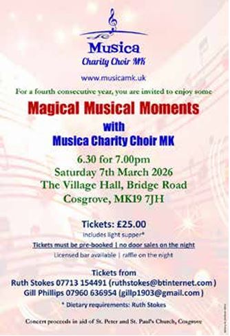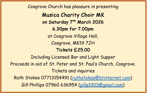 Cosgrove History Group Wednesday 11th March, 7.00pm for 7.30pm start in the Village Hall - £5.00 |